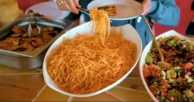 Самообслуживание "шведский стол" с барбекю из курицы, котлетами, спагетти, салатом, йогуртом и свежими фруктами.