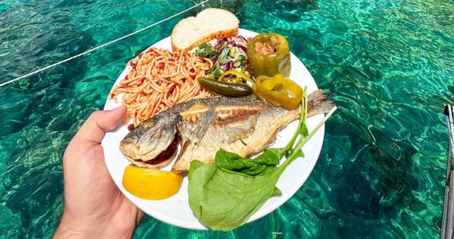 After your island adventure, return to the boat for a delicious buffet lunch prepared by our professional chefs. The menu includes fish barbecue, chicken, pasta, and fresh salad — perfect for recharging after a morning of exploration. 🍗🐟🥗