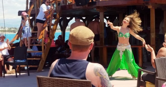Когда лодка возвращается, наслаждайтесь захватывающим выступлением танцовщицы живота, демонстрирующей экзотические танцевальные движения. Присоединяйтесь к пенной вечеринке на палубе, танцуйте под пузырями с бодрой музыкой, создавая незабываемые моменты 🎵🧼💃
