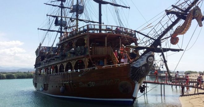 Лодка в стиле пиратского корабля отправляется в круиз по реке Манавгат примерно на час, окруженная пышной природой 🍃🌅