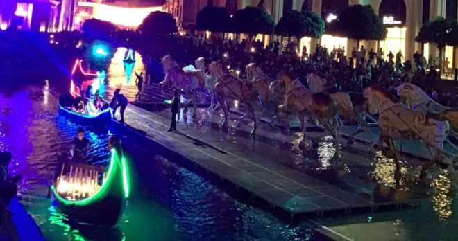 Glittering floats with costumed performers sail through the canals precisely at 21:30.