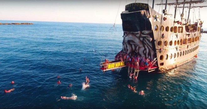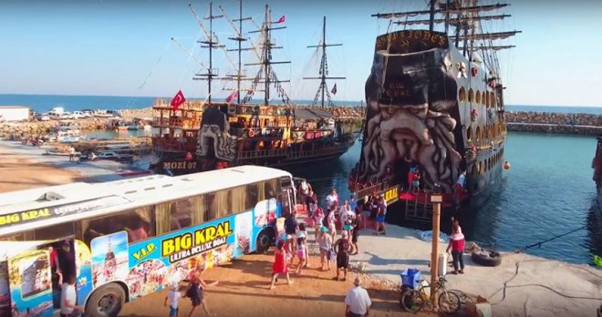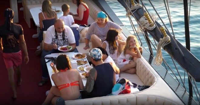 The adventure begins at 5:00 PM from Türkler harbor, approximately 45 km from Gündoğdu. After hotel transfer, relax on board the Legend Big Kral, fully equipped for a perfect evening on the water 🚍⚓. The cruise starts with a refreshing swimming break in the clear waters of the Mediterranean Sea, ideal for cooling off before dinner. Enjoy an exquisite buffet dinner served on board with a variety of dishes to satisfy every taste 🍗🥗🍝.
